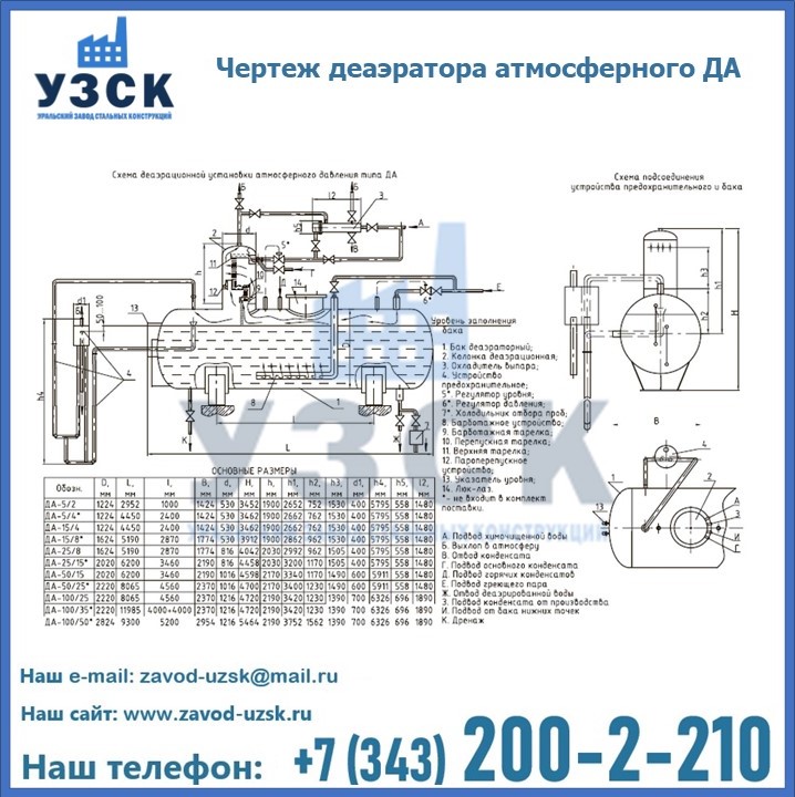 Приобрести качественное оборудование, в том числе, деаэраторы ДА, можно в компании УЗСК в Брянске. Мы предлагаем долговечную и надежную продукцию по приемлемой цене. Заказать и купить деаэраторы или другие изделия высокого качества можно через сайт Уральского Завода Стальных Конструкций, или позвонив по указанному в разделе «Контакты» телефону.